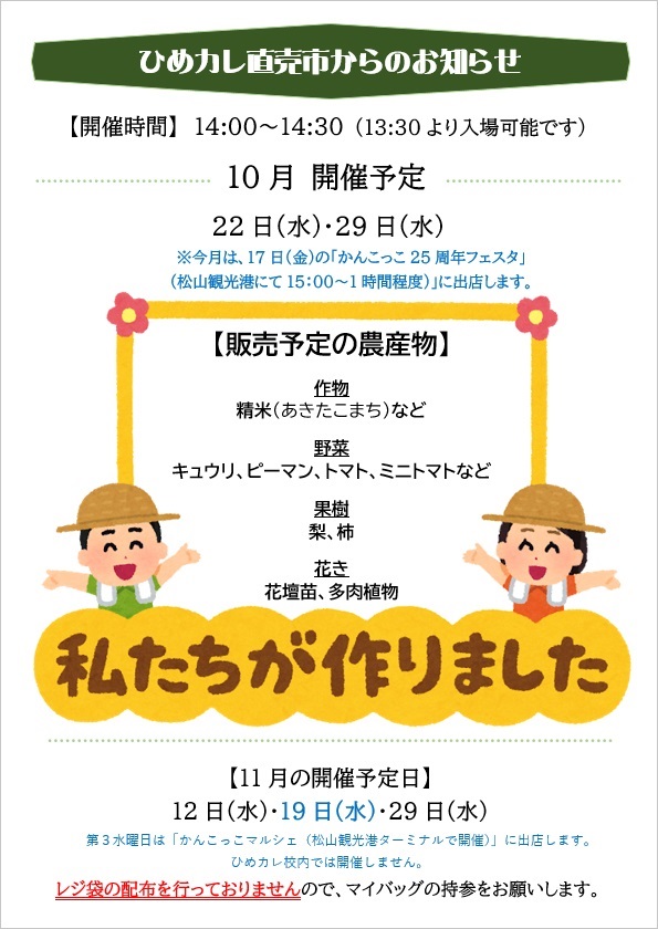 10月のひめカレ直売市は、22日(水)、29日(水)です。