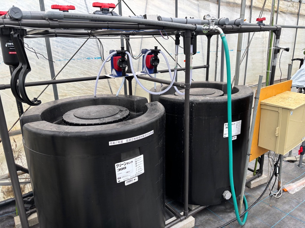 今回整備した高設栽培システムは「らくちん方式」を採用、2液1回路給液(かけ流し方式)とし、併せて炭酸ガス発生装置及び培地加温装置を設置しました。